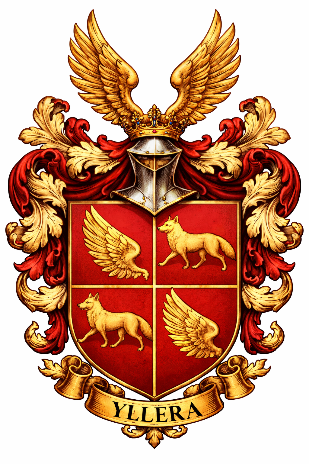 Armas: Escudo cuartelado: 1º y 3º, en campo de gules, un ala de oro extendida; 2º y 3º, en campo de gules, una raposa de oro pasante.
